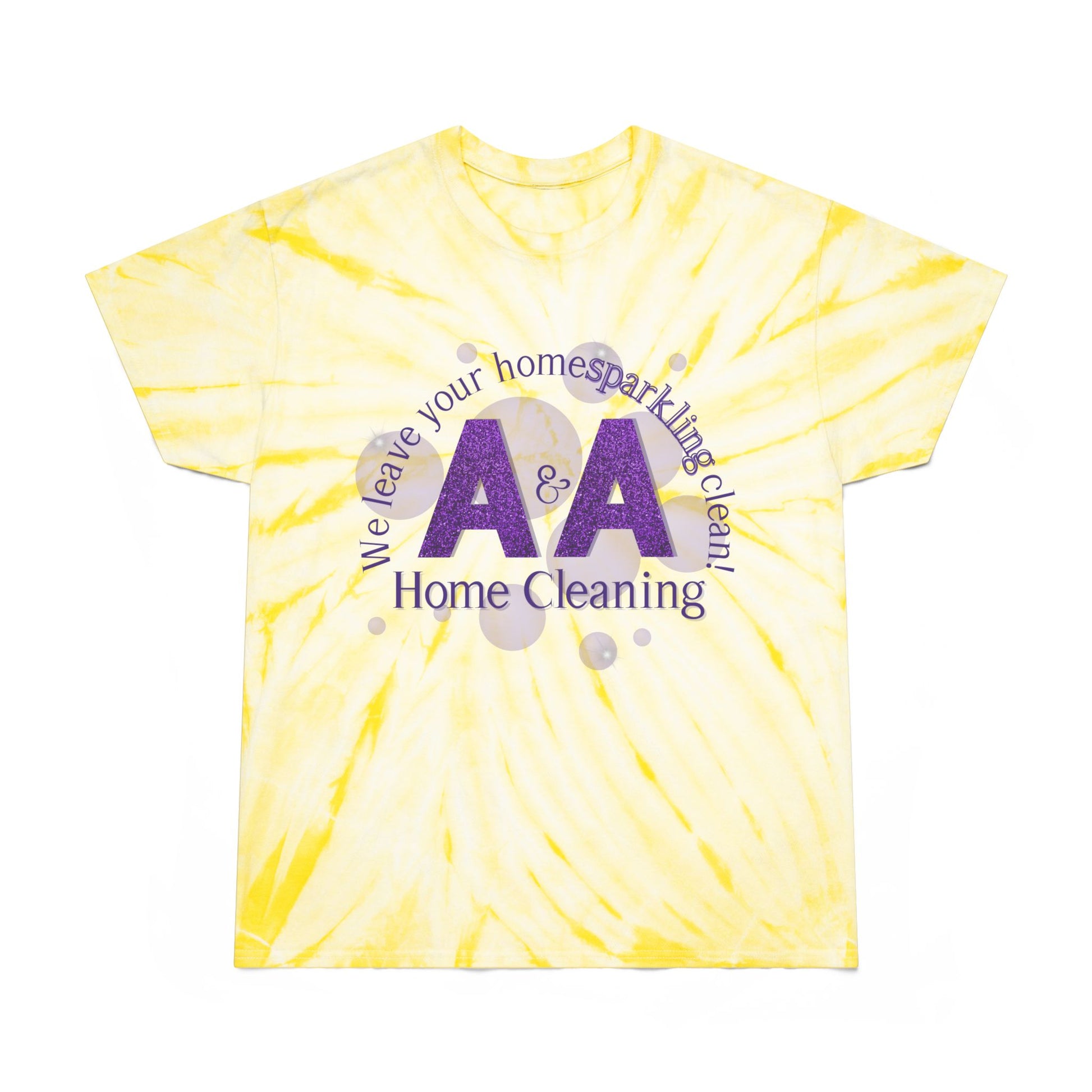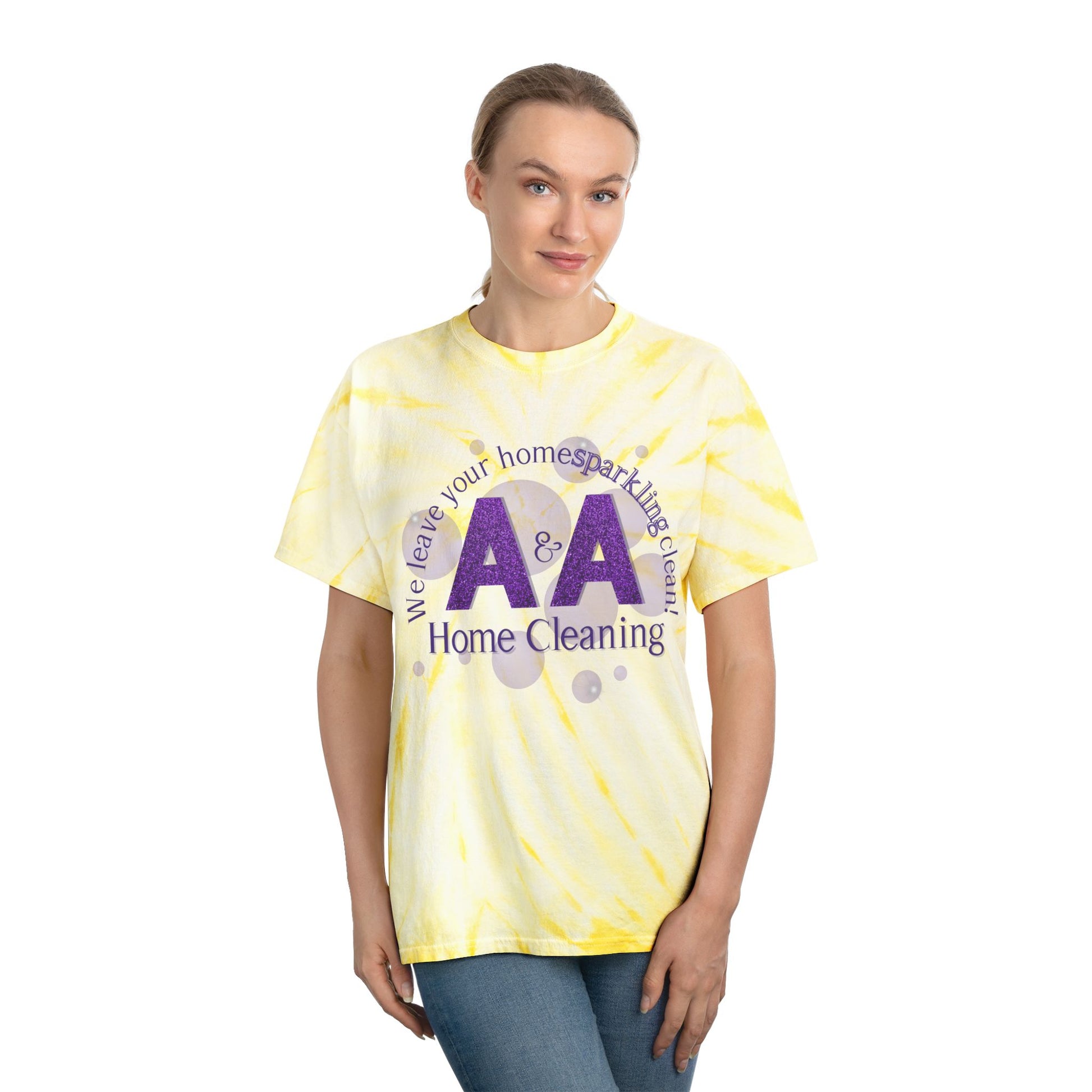 A&A, Purple logo on a yellow tie dye crew neck, gildan