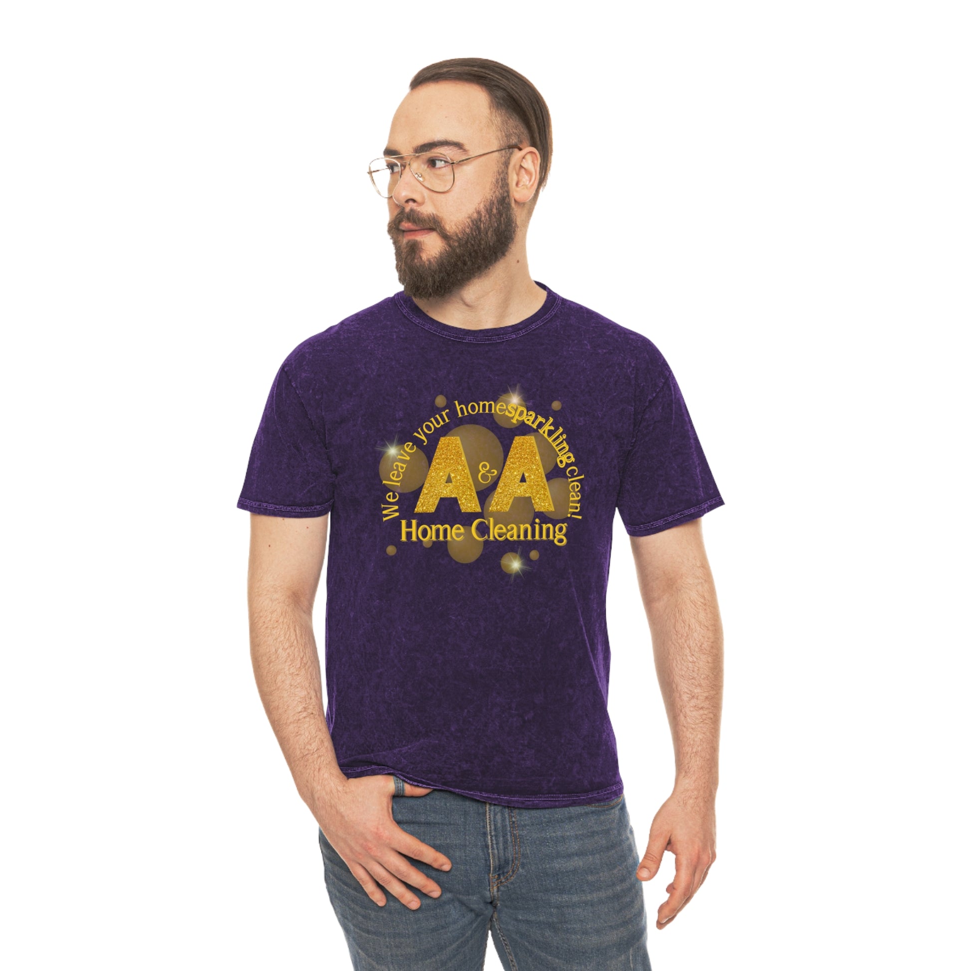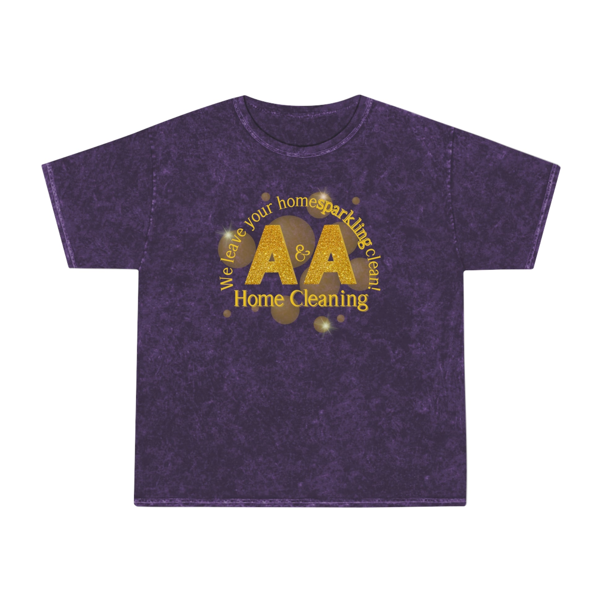A&A Yellow Logo on a distressed mineral purple crew neck, colortone