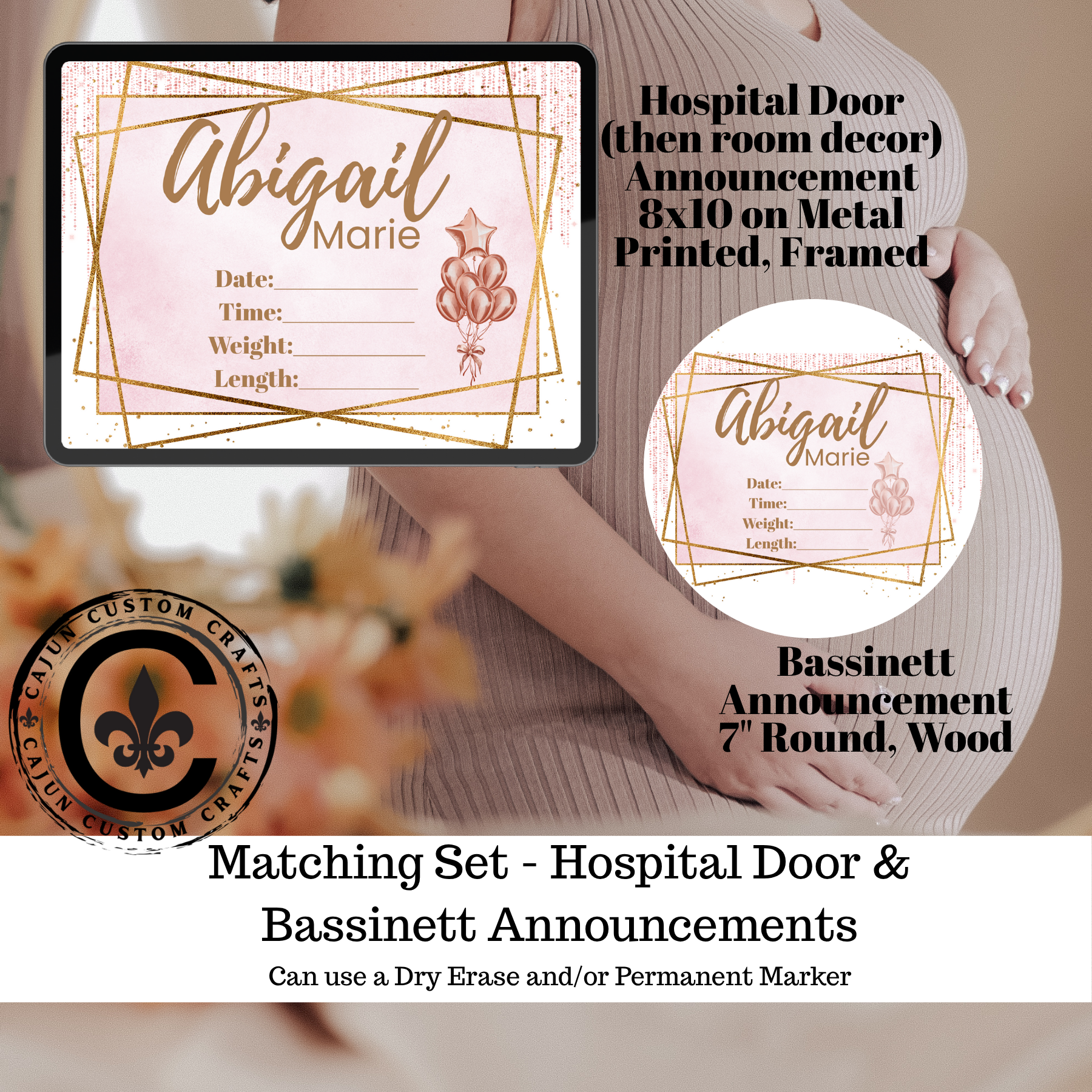 Baby Girl, Pink and Gold Shimmer, Birth Announcement, door hanger, table frame, bassinet display
