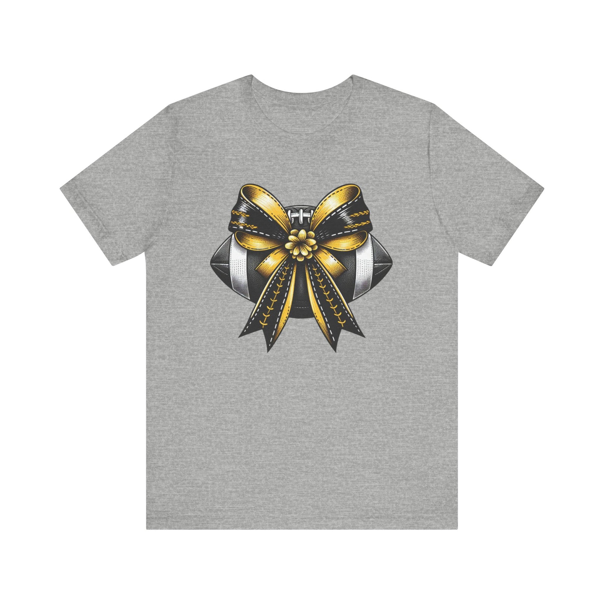 Football Bow Unisex Tee | Sporty Style Tee, Game Day T-Shirt, Casual Wear, Athletic Gift, Fan Apparel, Black and Gold, Saints