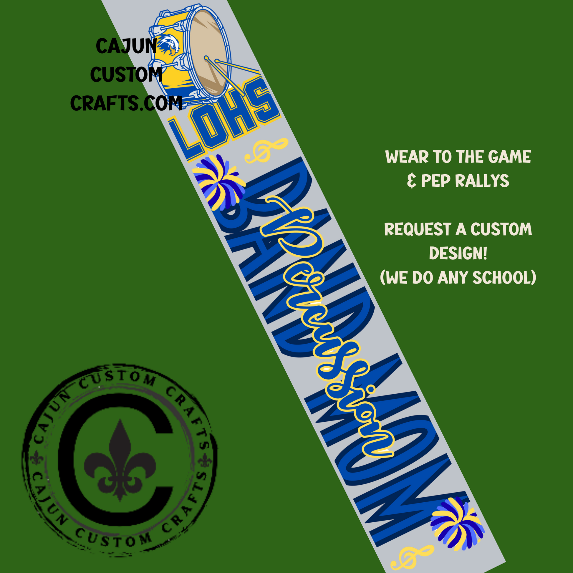 Personalized, Game Day Sash, Percussion Band Mom, Blue and Yellow