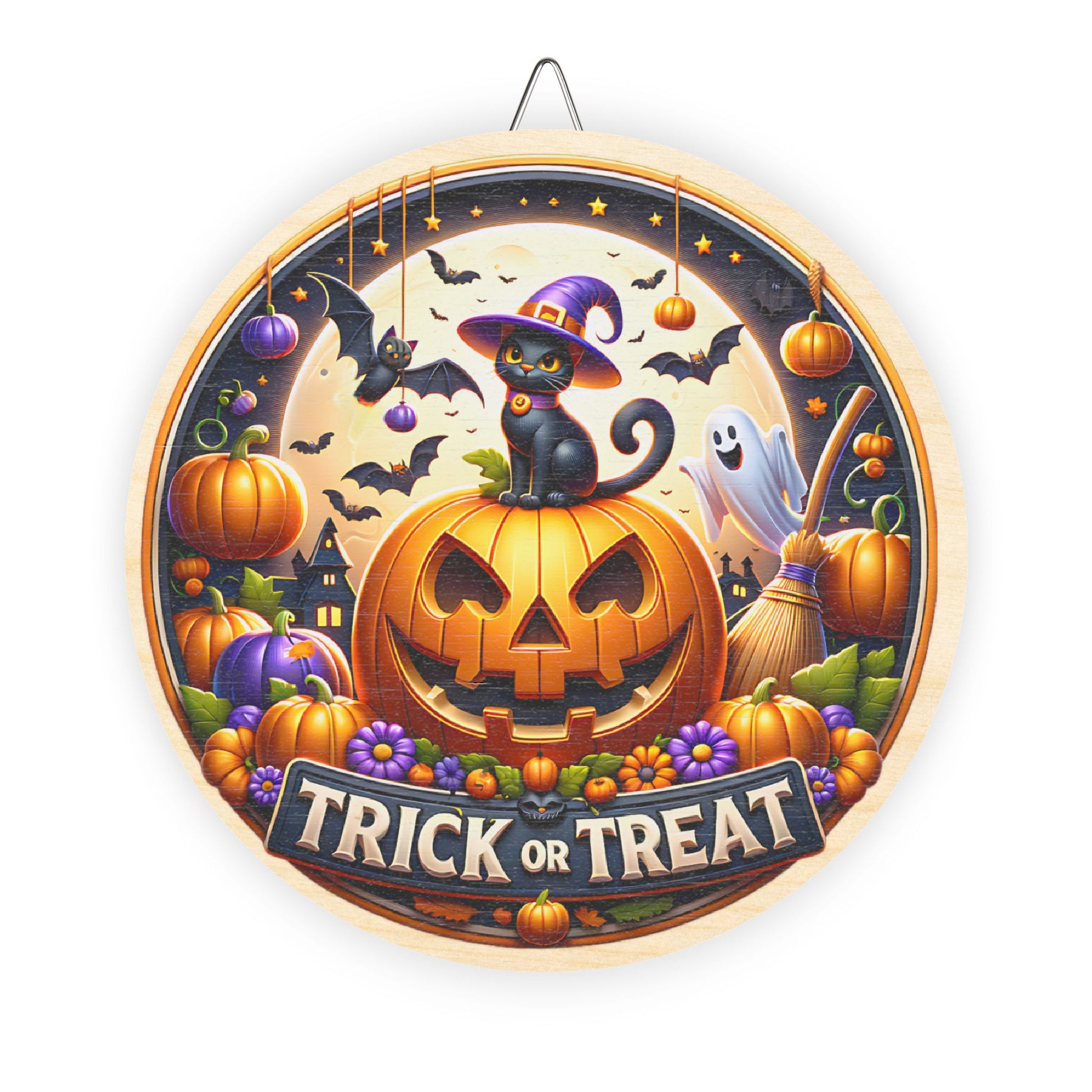 Halloween Welcome wooden door sign, mantle, entry table, decor, Black Cat, Bats, Pumpkins, Trick or Treat