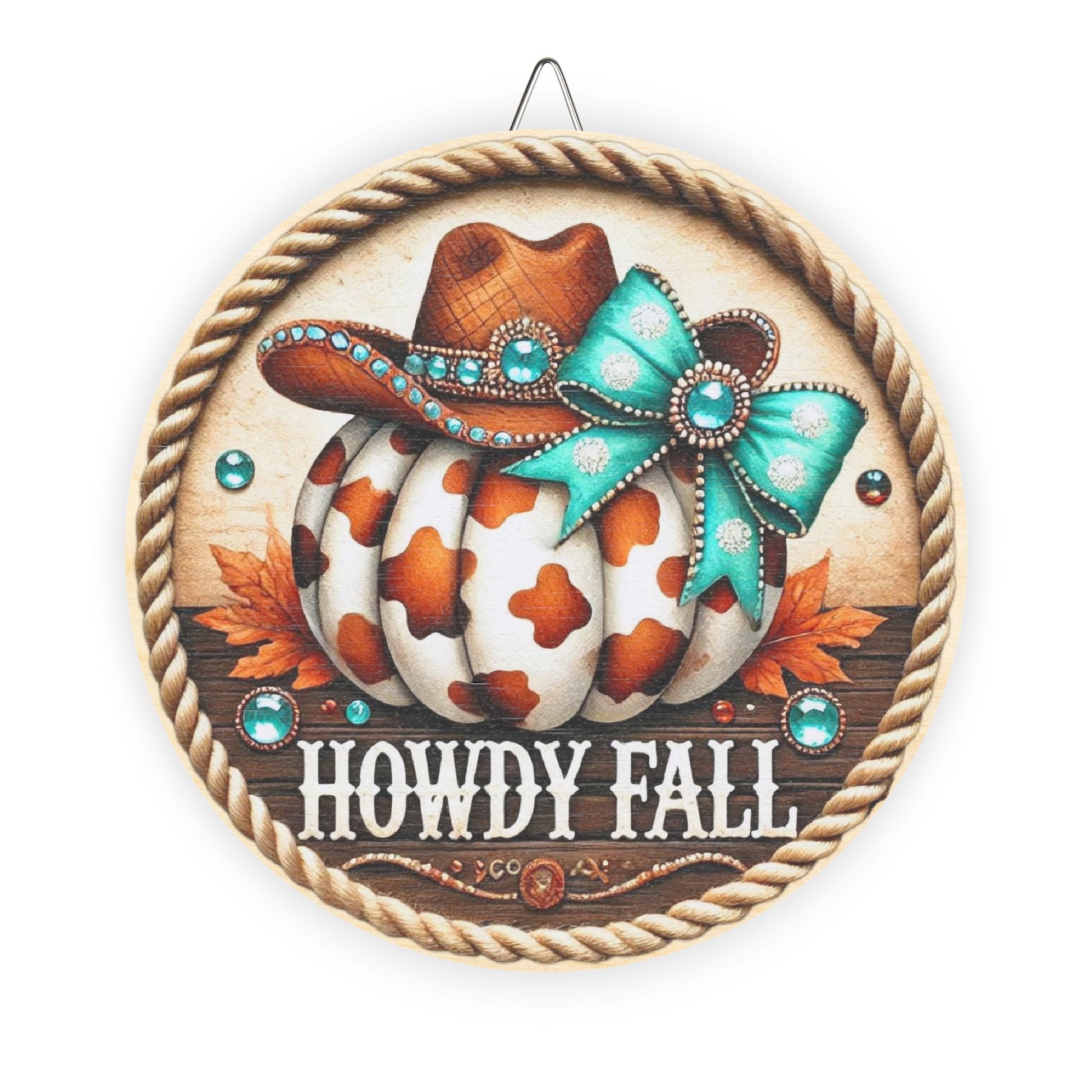 Howdy Fall, Cow Print Pumpkin, with a Cowgirl hat and coquette bow, Country Fall Welcome Door sign, Wooden, Entry Way, Mantle, Home Decor