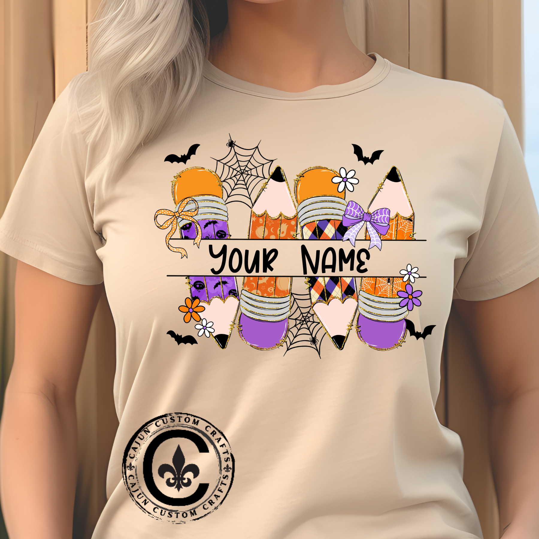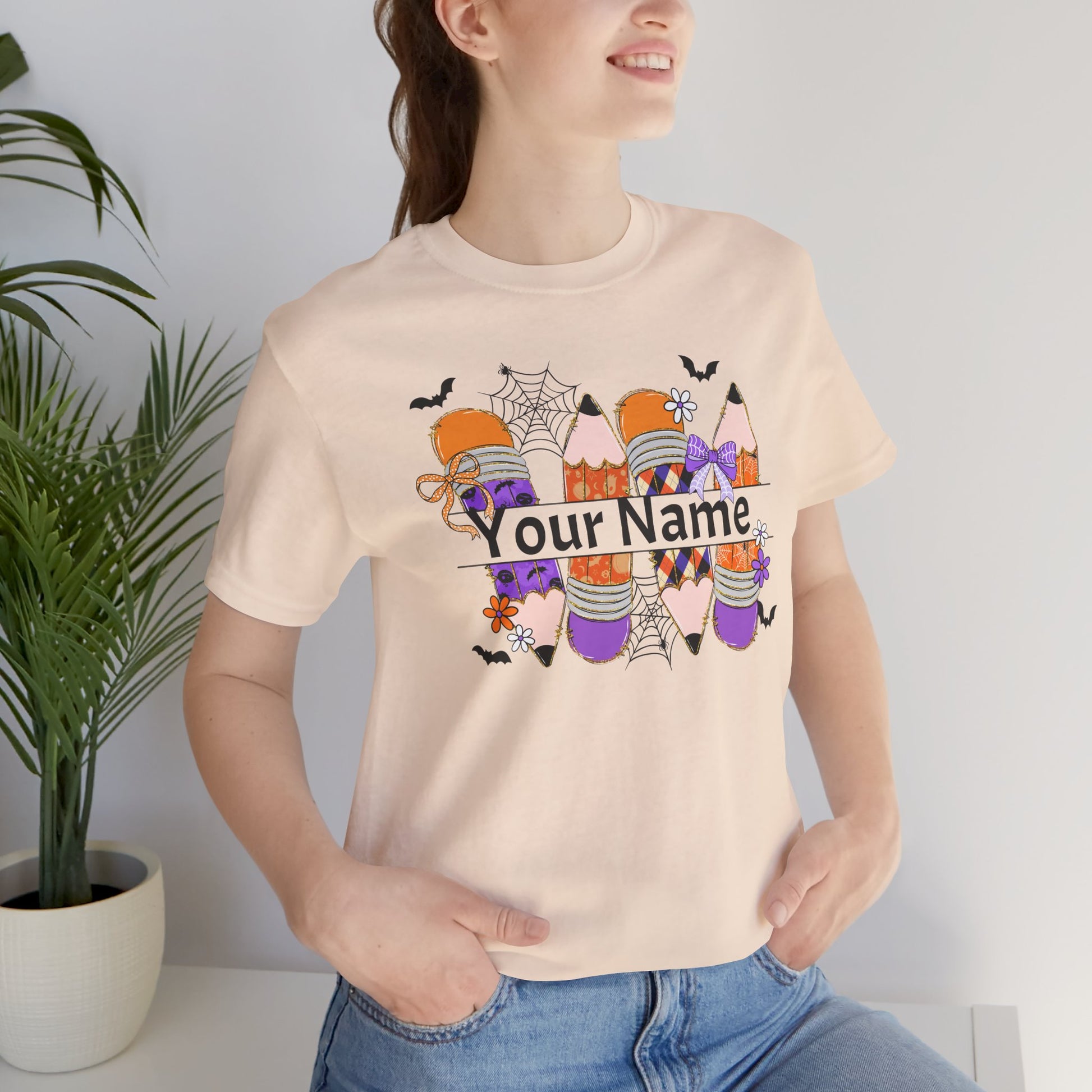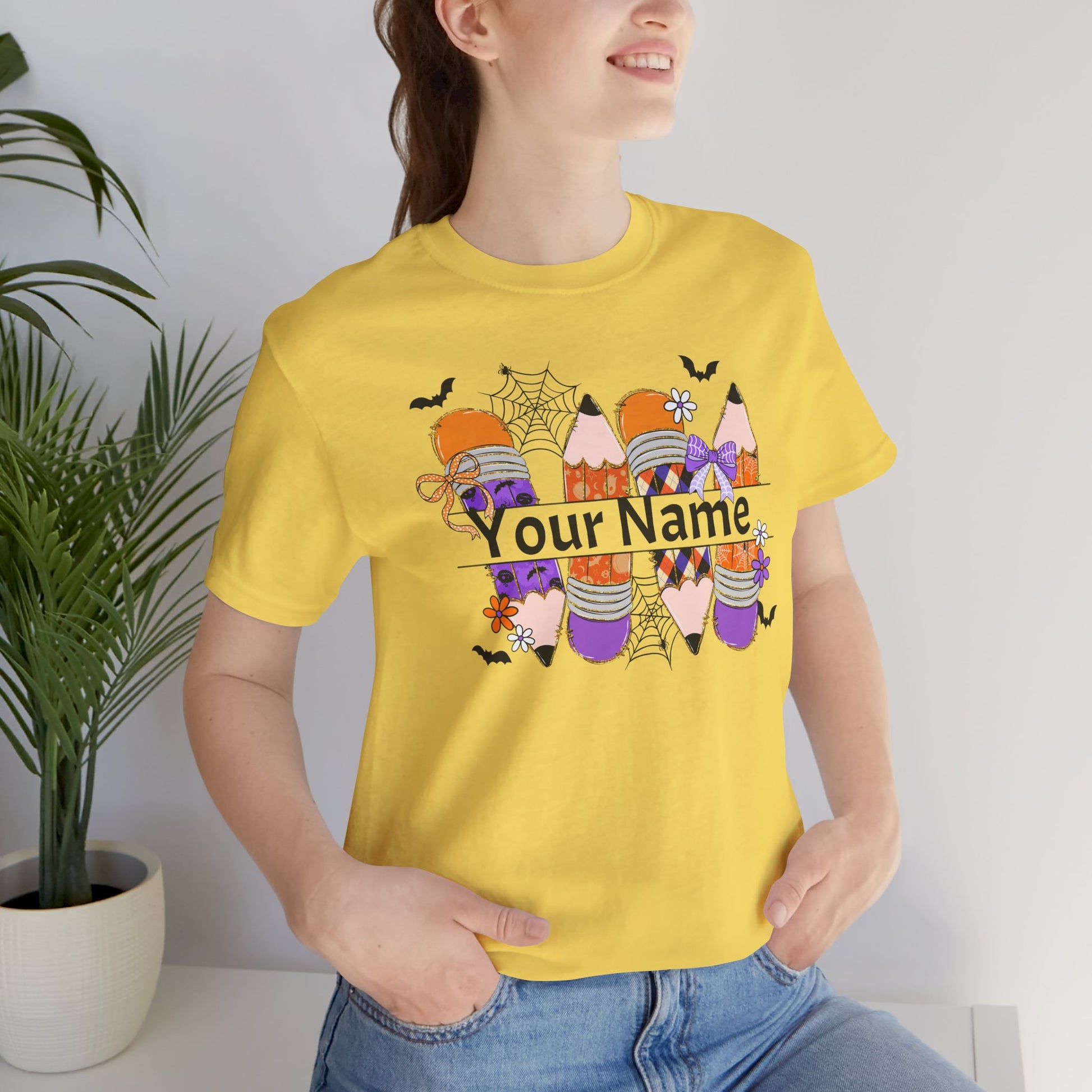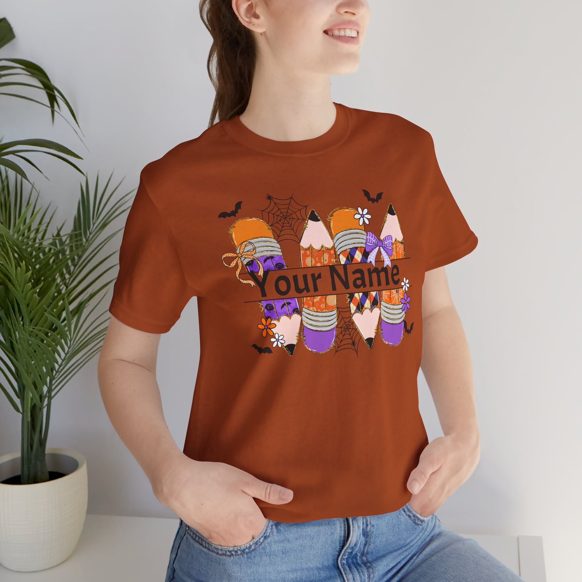 Personalized Halloween School Pencil with your name design, on a bella canvas shirt