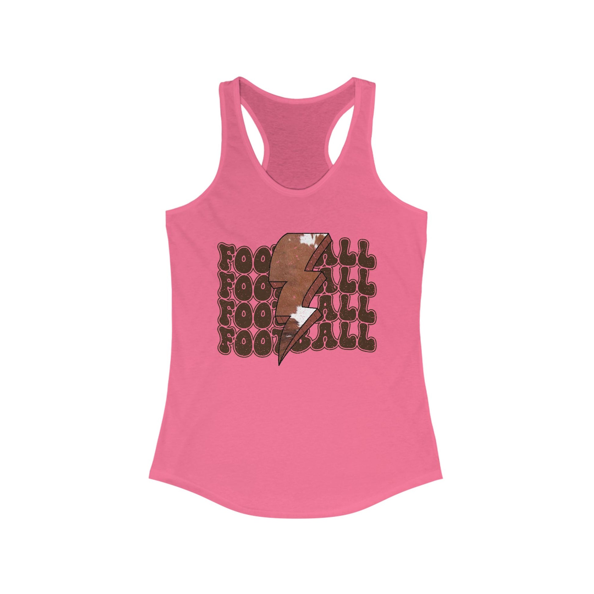 Stacked Football with a Cowhide Lightning bolt Women's Racerback Tank Top, Perfect for Game Day, Sports Events, Tailgating, and Everyday Wear